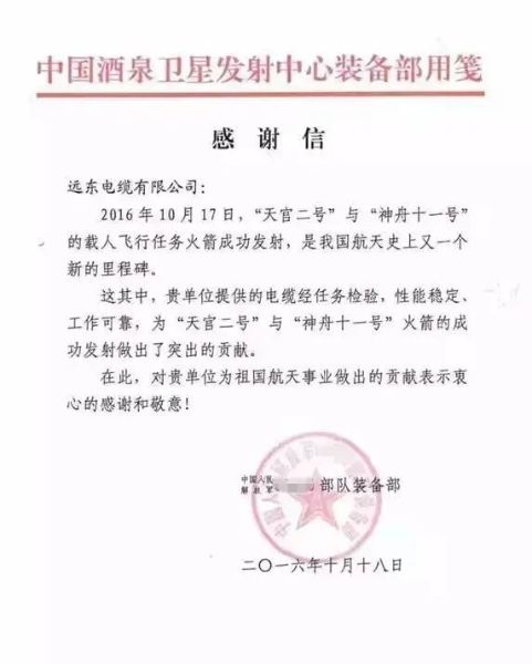 时间拉回七年前,远东电缆收到过一封来自酒泉卫星发射中心的感谢信,记录了“紧急时刻”下远东电缆与中国航天的链接。2016年9月16日晚近12时,“神舟十一号”发射工作已经进入调试阶段,远东电缆突然接到来自酒泉卫星发射中心的电话,中心表示希望公司能在三天内,赶制一批航空用高端电缆产品并送至酒泉,助力航天基地建设及“神州十一号”发射。“公司接到任务快速反应,立即停下手头所有订单的生产,全力赶工,最终用72小时的“火箭速度”不辱使命交上满意答卷。”远东电缆相关负责人表示。