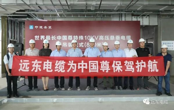 从2018年3月首批产品敷设,到8月份长达820米的世界最长特殊10KV高压垂悬电缆成功敷设,历经6个月的吊装作业,远东电缆一共为中国尊项目敷设了24根悬垂电缆,总长达15132米,总重达136.38吨,创造了多个世界首次、世界之最。这一成绩的取得离不开远东团队的努力和付出,从电缆进场开始就进行全程跟踪,以创新技术破解了超高层供电系统技术难题,保障了吊装电缆敷设工作安全、有序进行,实现了超高层垂直高压电缆敷设技术的新突破。